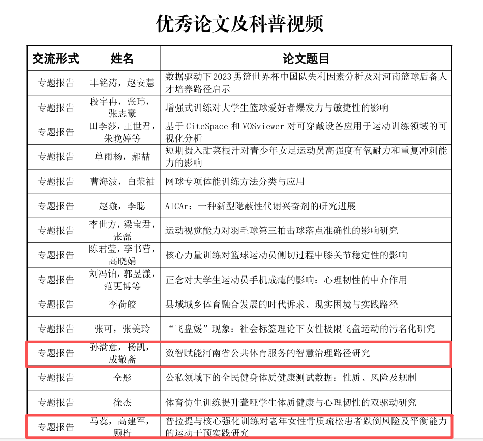 我院教师以及研究生获第一届河南省体育科学大会优秀论文