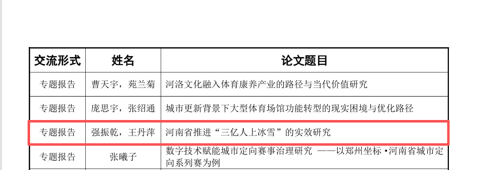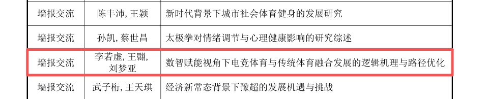 在首届河南省体育科学大会上,我院师生科研成果取得显著成效,共4项研究成果荣获大会录用。其中,孙满意、强振乾、马蕊三位教师分别作专题报告,李若虚教师的成果入选墙报交流环节。所有教师提交论文均被中国知网收录,体现了研究的规范性与学术价值。金志雷、周迅两位同学的专题报告获知网收录,展现了学院在创新人才培养和学术梯队建设方面的扎实成果。师生成果同步获得学术认可,反映了我院科研训练体系的完整性与有效性。