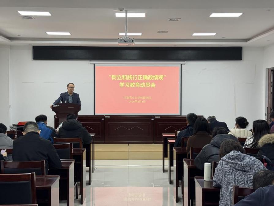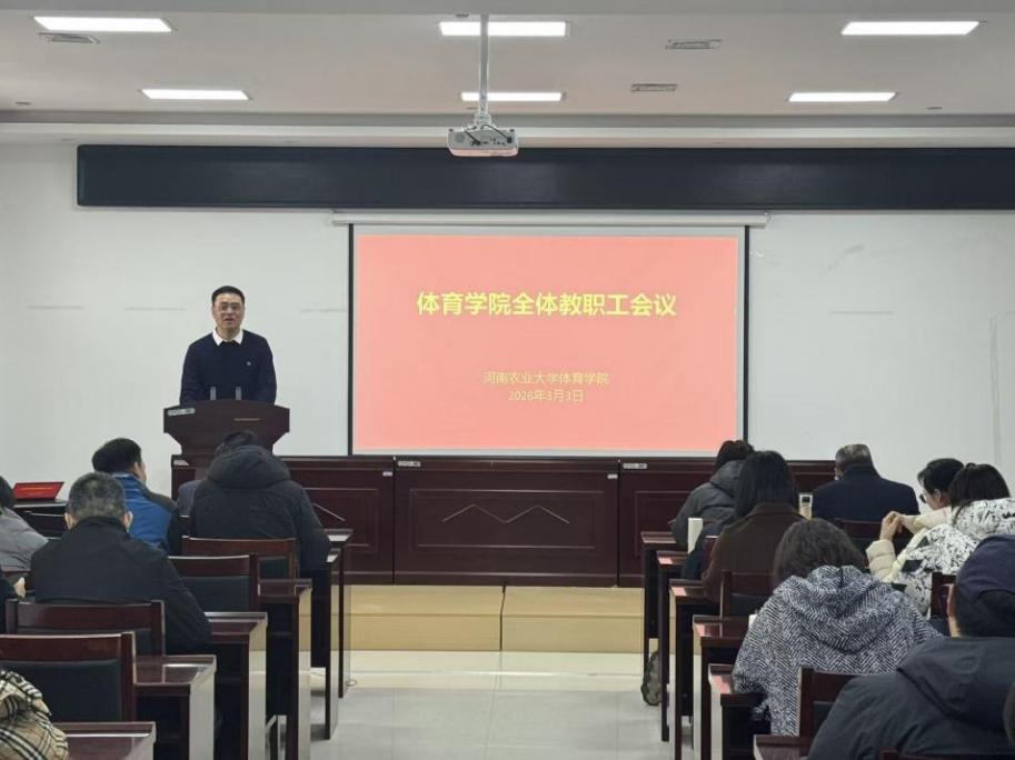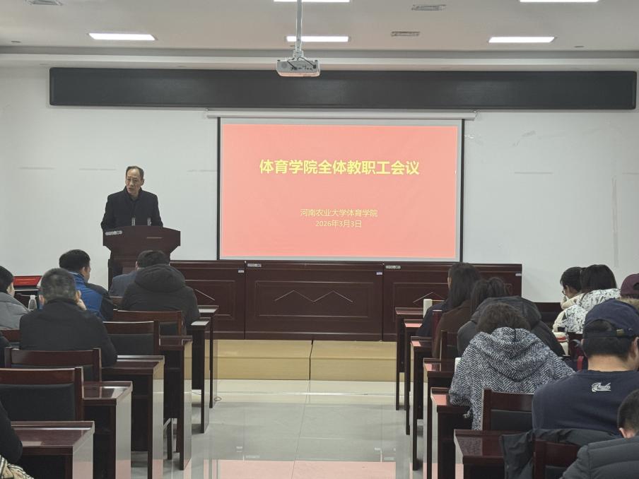(通讯员/图 白杨)为统一思想、凝聚共识、部署任务、转变作风,扎实推进我院新学期各项工作高质量开展,3月3日下午,我院召开2026年度春季新学期全体教职工大会暨“树立和践行正确政绩观”学习教育动员会。学院领导班子、全体教师参会,会议由体育学院院长唐大鹏主持。